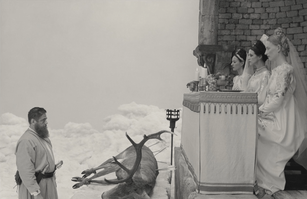 In his second dream, Zsa Zsa is carrying a dead stag riddled with arrows and presents it in front of three women (presumably his three ex-wives.) He is a provider. Food perhaps. He cuts open the stag in front of the three women and gold coins proceed to pour out of the stag. The middle wife, presumably Liesl’s mother says, “Good Husband. What tribute is this?” He responds, “money,” his idea of being a provider. The middle wife says, “She’s not your daughter.” He awakens.